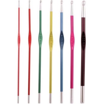 Lehký tvarovaný hliníkový pletací háček KnitPro v nádherných barvách v kombinaci se stříbrnými...