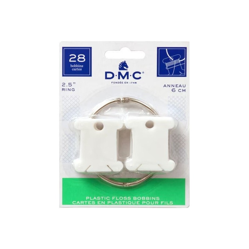 Plastové namotávky na bavlnky DMC (28 ks) na kovovém kroužku o průměru 6 cm