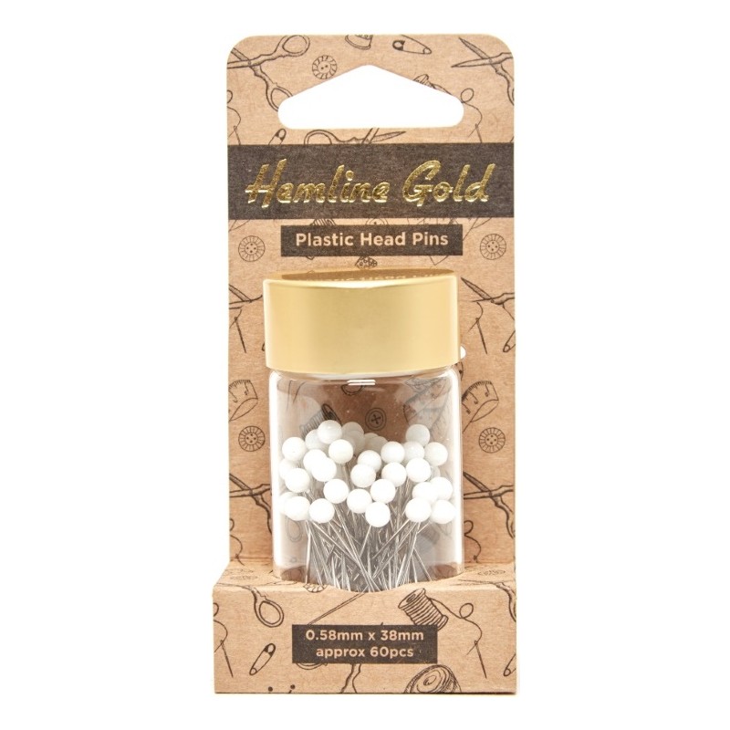Špendlíky s bílými hlavičkami 60 ks ve skleněné dóze Hemline Gold