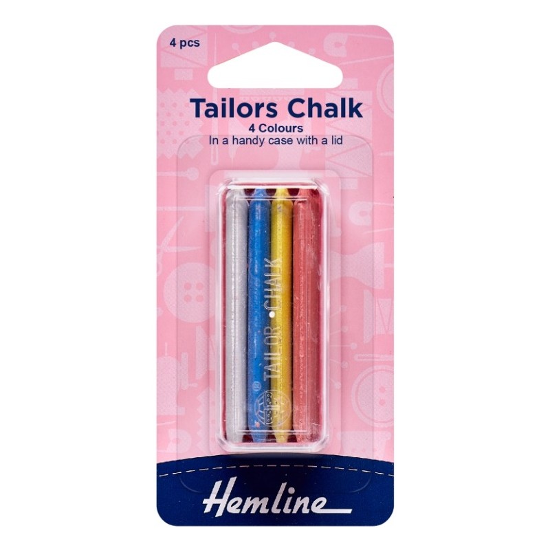 4 barevné krejčovské křídy (bílá, modrá, žlutá, červená) v plastové krabičce s víčkem.