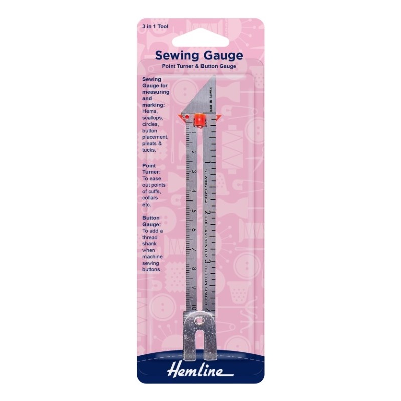 Měřidlo s posuvným červeným ukazatelem pro různé úkony při šití a pletení. Používá se k přesnému měření lemů, záhybů, umístění knoflíkových dírek, skladů atd. Obsahuje také pomůcku pro vytvarování vrcholů límců nebo manžet atd.
