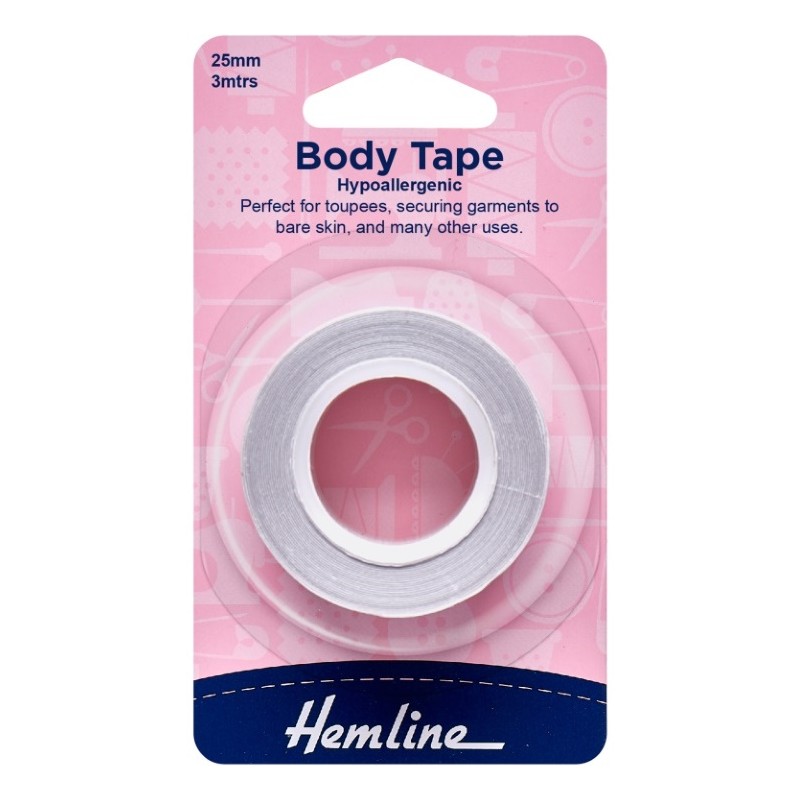 Hypoalergenní oboustranná lepící páska (3 m x 25 mm) na přichycení oblečení na tělo (oblast dekoltu), vhodná i na tupé a paruky.