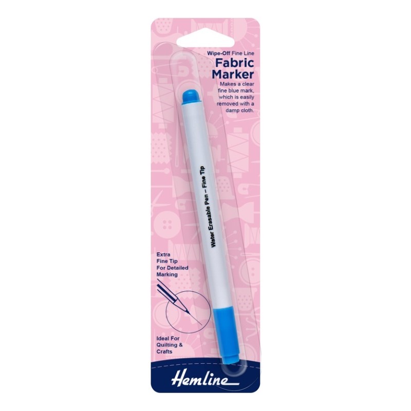 Modrý značkovač na látky pro jasné značení na barevných látkách. Značení lze odstranit setřením navlhčeným hadříkem nebo promnutím ve studené vodě.