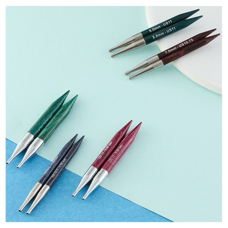 Šroubovací (výměnné) kruhové jehlice z řady Dreamz od KnitPro z březového dřeva v nádherných barvách se stříbrnými koncovkami