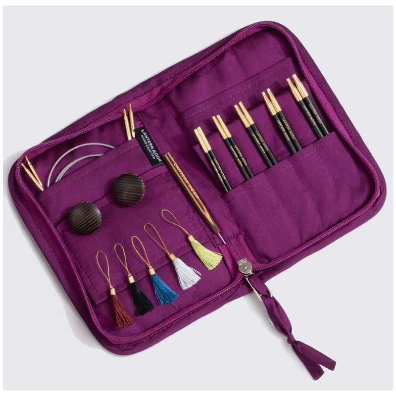 Set obsahuje 5 párů ebenových výměnných kruhových jehlic 10 cm ve vel. 3,00, 3,50, 4,00, 4,50 a 5,00 mm, spolu s příslušenstvím jsou uložené v krásném látkovém pouzdru na zip