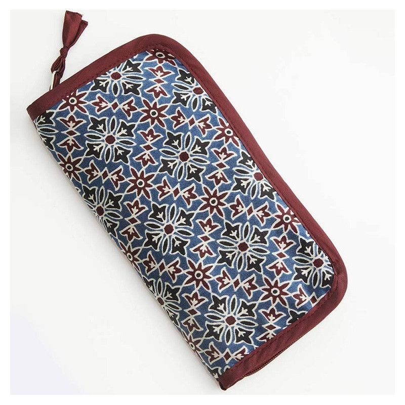 Pouzdro ze saténového modalu je vyrobené s použitím tradiční tkaniny „Ajrak“, historicky významnou technikou tkaní, s blokovým potiskem. Materiály „Ajrak“ jsou známé svým jednoduchým, ale elegantním designem, často odvozeným z přírody.
