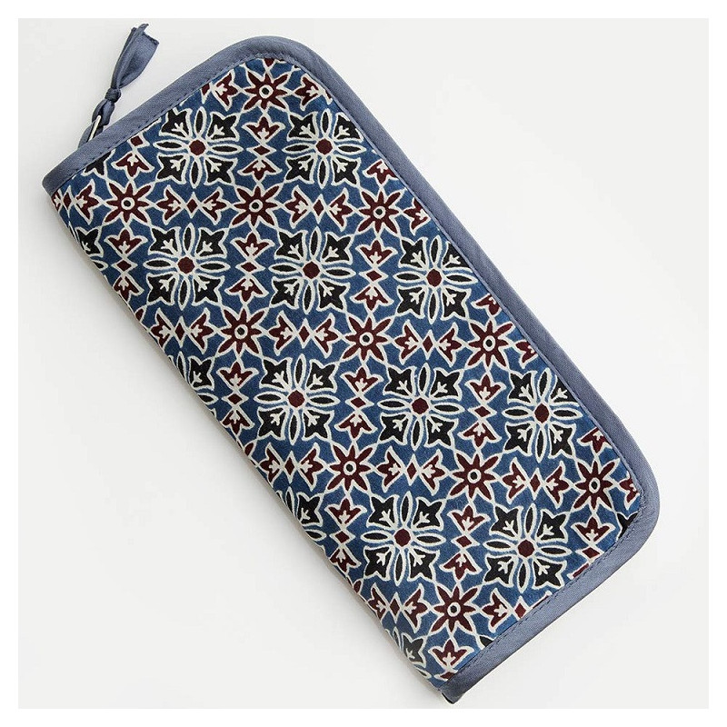 Pouzdro ze saténového modalu je vyrobené s použitím tradiční tkaniny „Ajrak“, historicky významnou technikou tkaní, s blokovým potiskem. Materiály „Ajrak“ jsou známé svým jednoduchým, ale elegantním designem, často odvozeným z přírody.