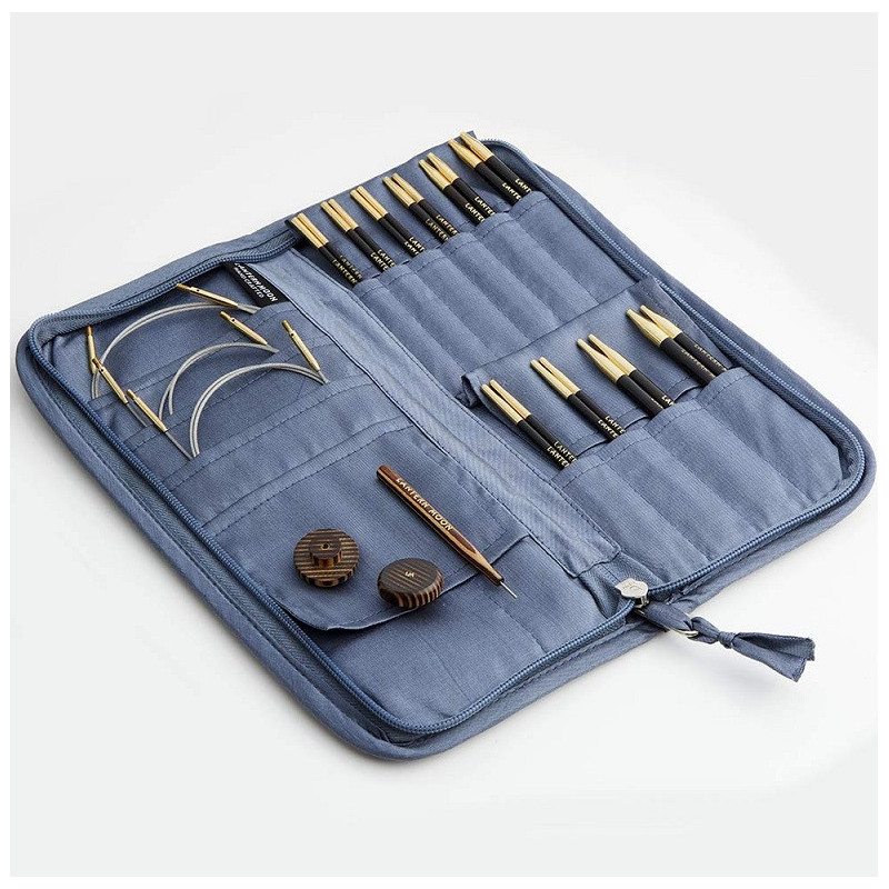 Polstrované pouzdro obsahuje vnitřní kapsy pro bezpečné uložení jehlic (i jiného příslušenství) a jejich organizaci podle velikostí. Zapínání je na zip.