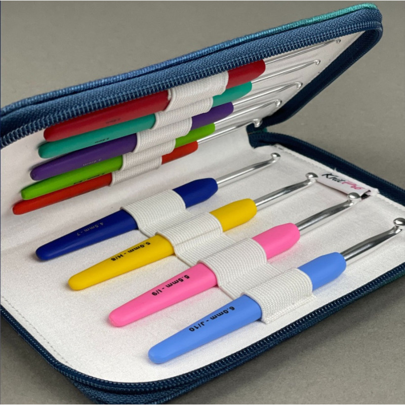 Set s 9 pletacími háčky s barevnými rukojeťmi ve vel. 2,00, 2,50, 3,00, 3,50, 4,00, 4,50, 5,00, 5,50 a 6,00 mm v tyrkysovém látkovém pouzdru na zip