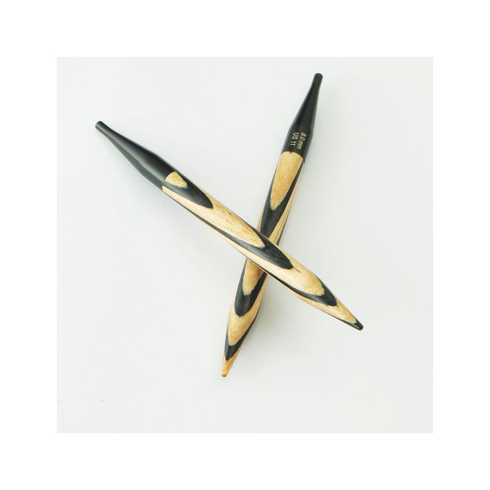 Jehlice jsou ručně vyráběny z laminovaného březového dřeva a zdobí je výrazný černo-bílý chevron vzor, který zajišťuje vysoký kontrast a lepší viditelnost při práci s různými barvami přízí.