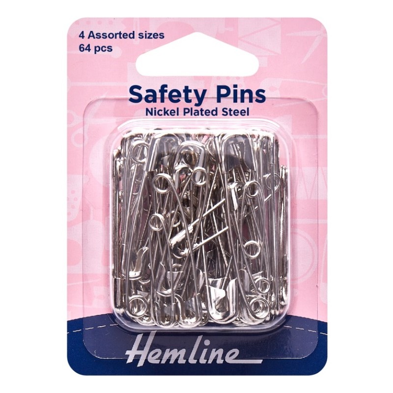 Artikl 410.99.64 Spínací špendlíky 64 ks stříbrné Hemline, VO balení 5 karet