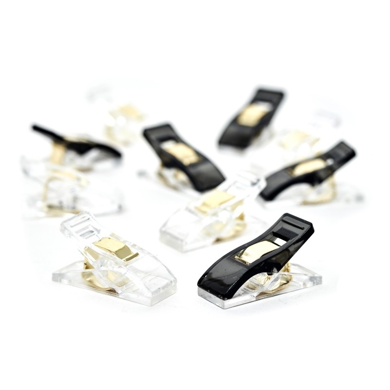 Velké balení 30 kolíčků na látky Premium v černé a transparentní barvě se zlatými prvky, snadno, bezpečně a šetrně beze stop udrží látky u sebe