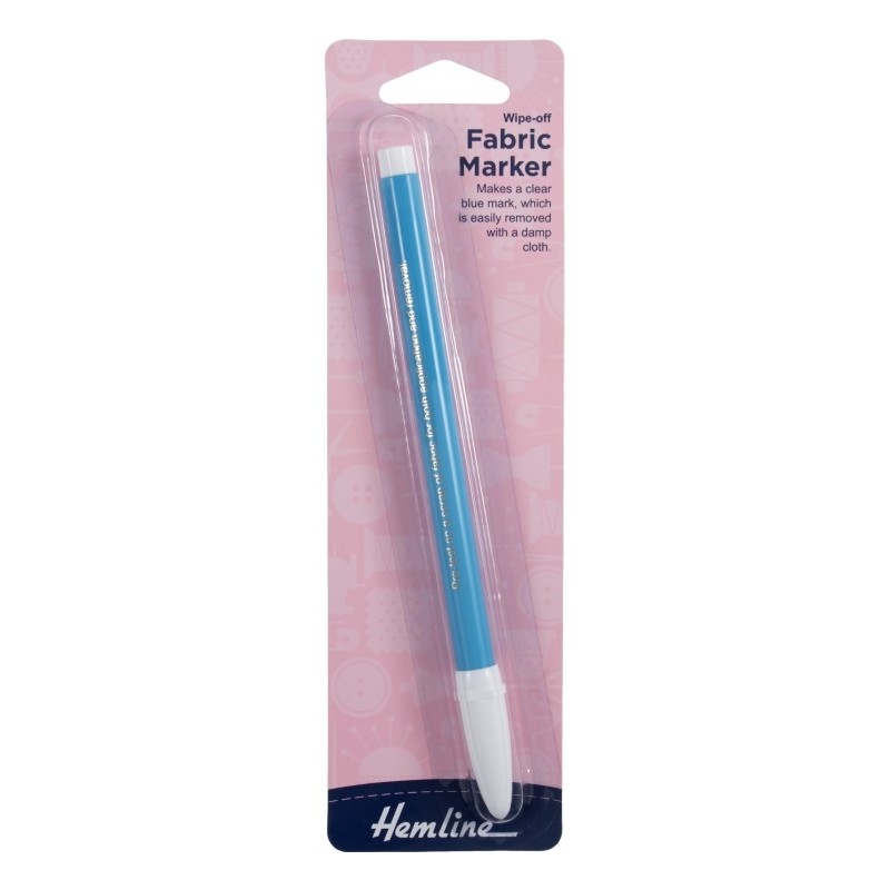 Modrý značkovač na látky pro jasné značení na barevných látkách. Značení lze odstranit setřením navlhčeným hadříkem nebo promnutím ve studené vodě.