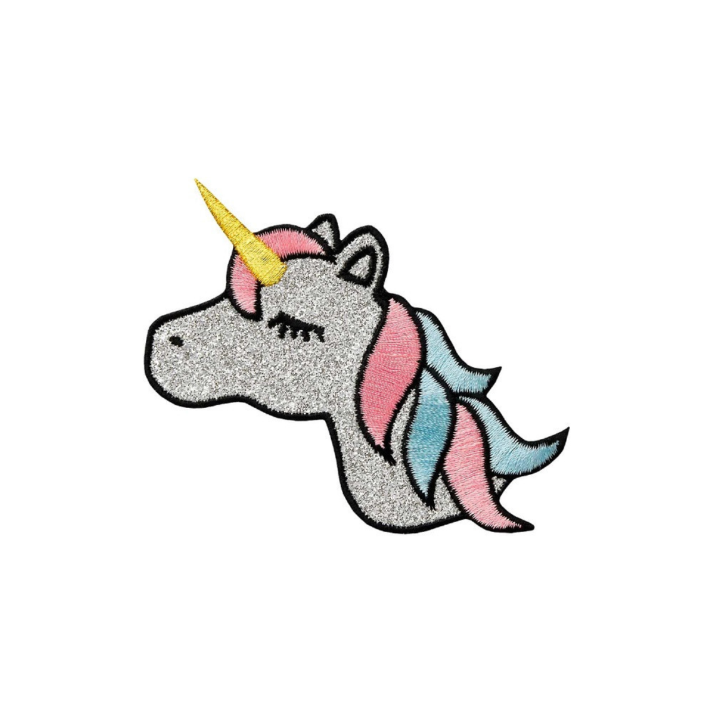 Artikl 12100 Nažehlovačka Jednorožec se stříbrnými glitry 9,5 x 5,3 cm Monoquick, VO balení 3 ks