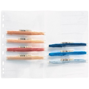 Plastový list s kapsami k uložení až 15 ks přízí napnutých na plastových držátkách