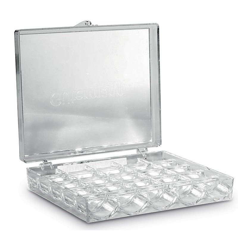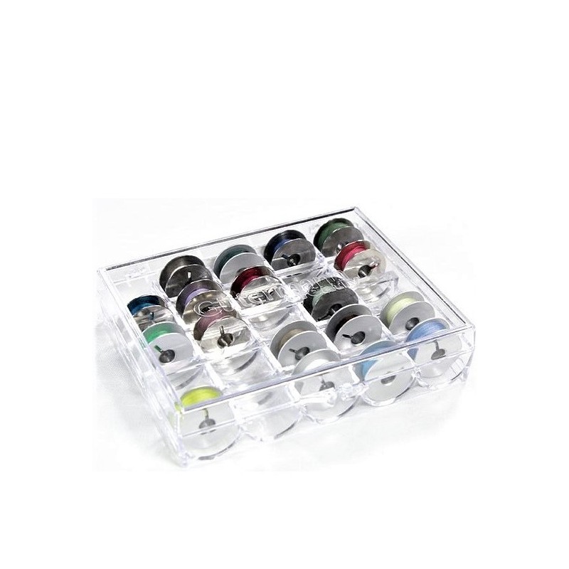 Více se dočtete v popisuTransparentní plastový box s víkem na uložení a organizaci spodních cívek s nitěmi. Rozměr: 122 x 27 x 109 mm