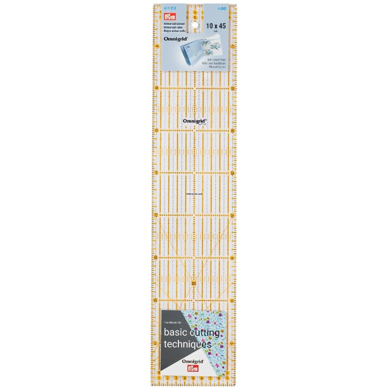 Univerzální čiré pravítko Omnigrid s dobře viditelným žluto-černým rastrem v cm a palcích umožňuje přesné značení na tmavých i světlých látkách. Laserový potisk na spodní straně pravítka je odolný proti poškrábání a eliminuje optické zkreslení. Silný a odolný materiál umožňuje bezpečné vedení řezacích koleček a nožů po řezací podložce. Pravítko má očko pro zavěšení.