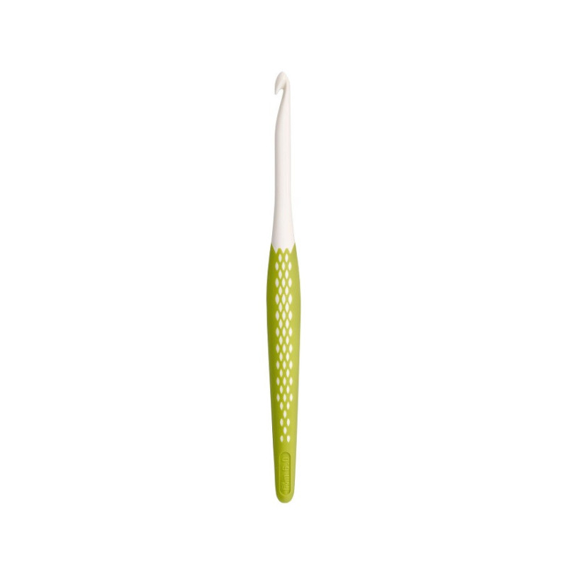 Pletací háček z řady prym.ergonomics v oceňovaném ergonomickém designu leštěný do hladka pro snadné a příjemné háčkování bez námahy s protiskluzovou barevnou rukojetí