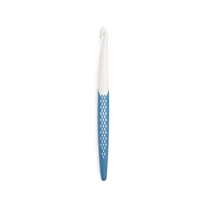 Pletací háček z řady prym.ergonomics v oceňovaném ergonomickém designu leštěný do hladka pro snadné a příjemné háčkování bez námahy s protiskluzovou barevnou rukojetí