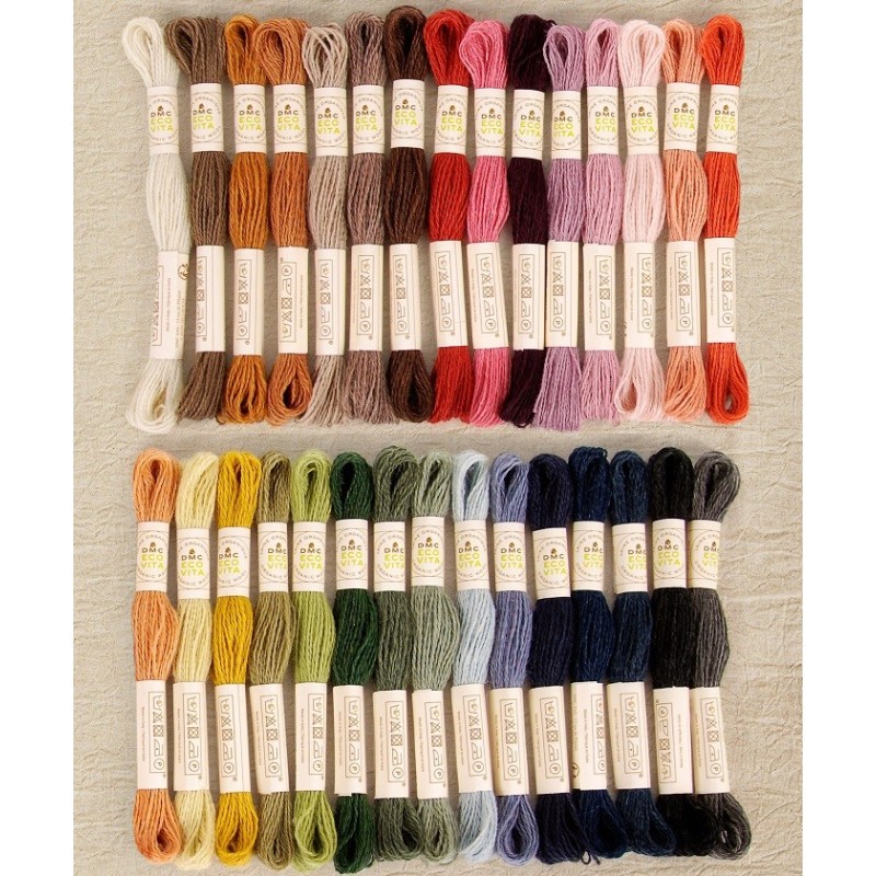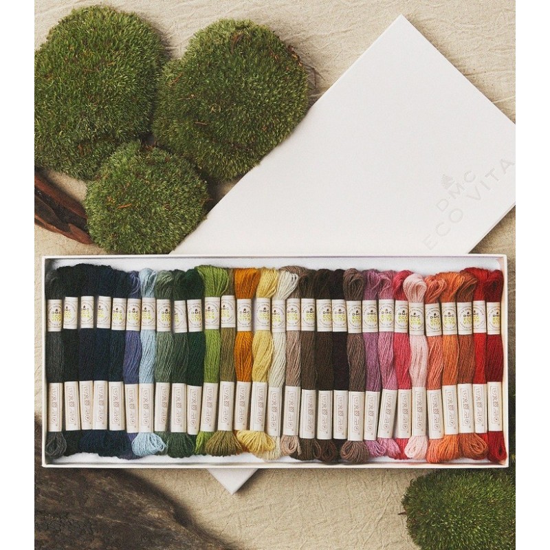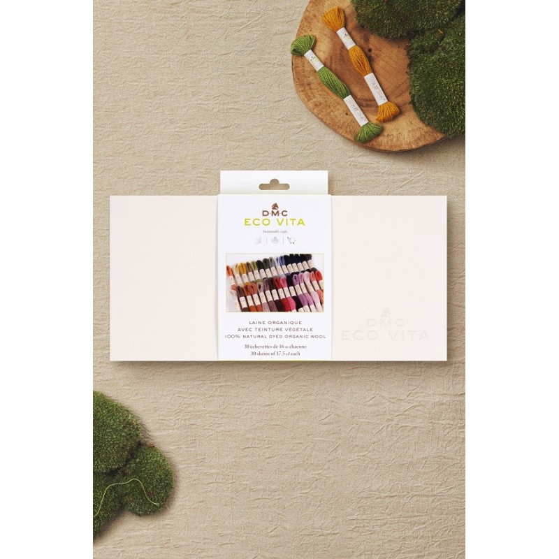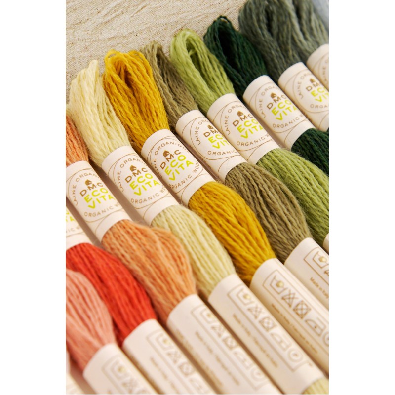 100% organická vlněná vyšívací příze DMC Eco Vita 360 je milostným dopisem přírodě, svou bohatou barevnou paletu získala výhradně z přírodních barviv s použitím přísad, jako jsou ořechy, rebarbora, indigo a jalovec. Eco Vita 360 je velmi univerzální a příjemná příze, ať už ji použijete na tradiční nebo křížkové vyšívání, na práci s dutou jehlou, tkaní nebo zašívání.