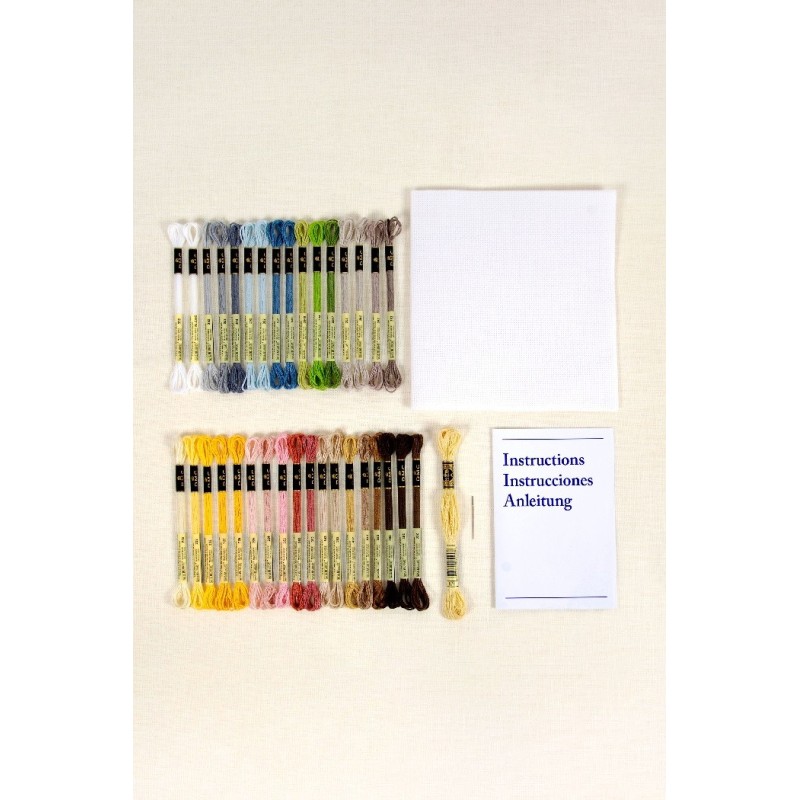 Sada obsahuje vše potřebné k vyšití motivu křížkovým stehem: vyšívací bavlnky DMC Mouliné Spécial, vyšívací látku s čtverečkovanou strukturou 100% bavlna, 1 vyšívací jehlu a obrázkový návod