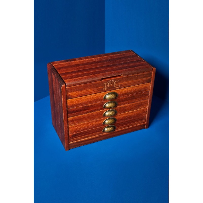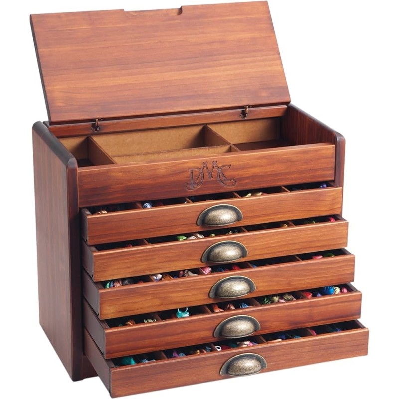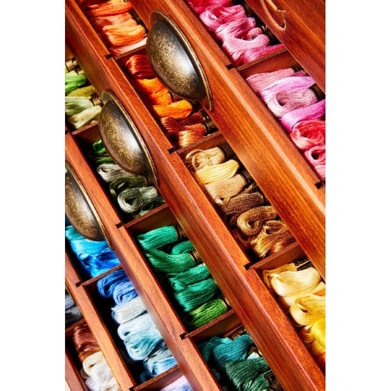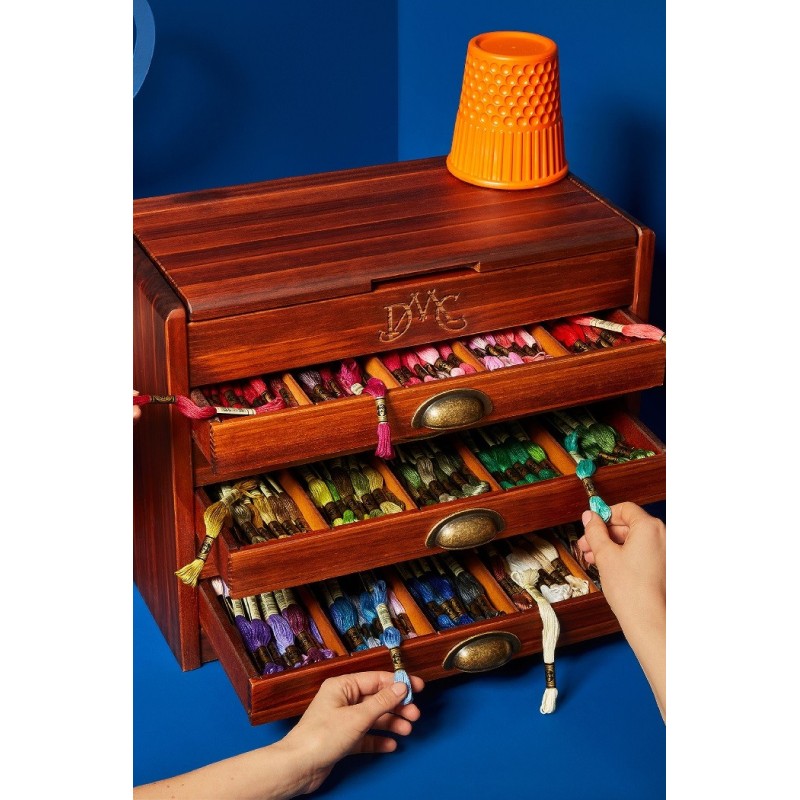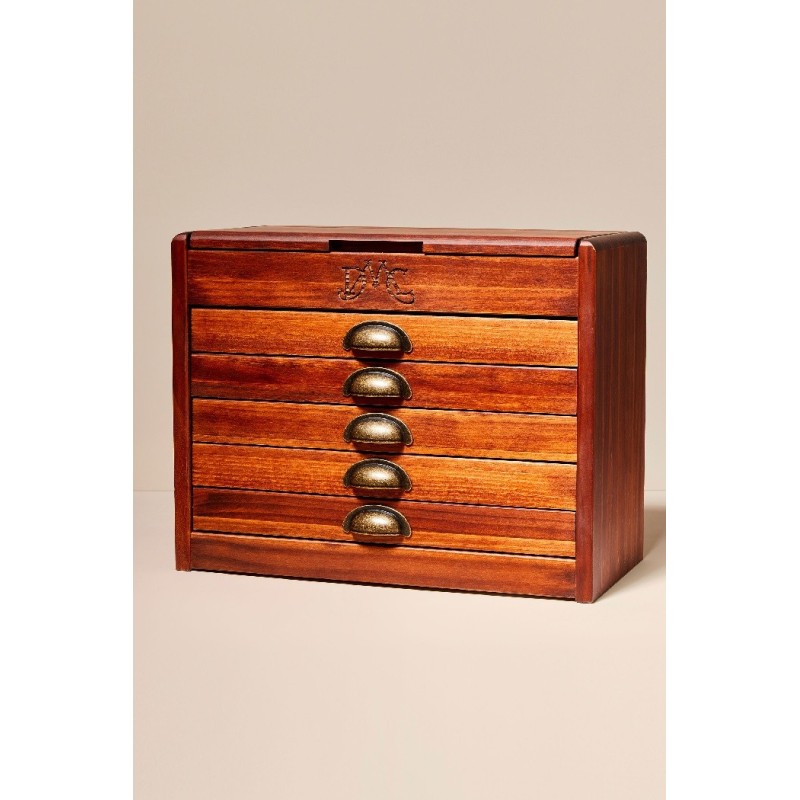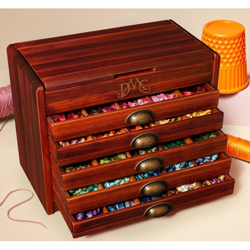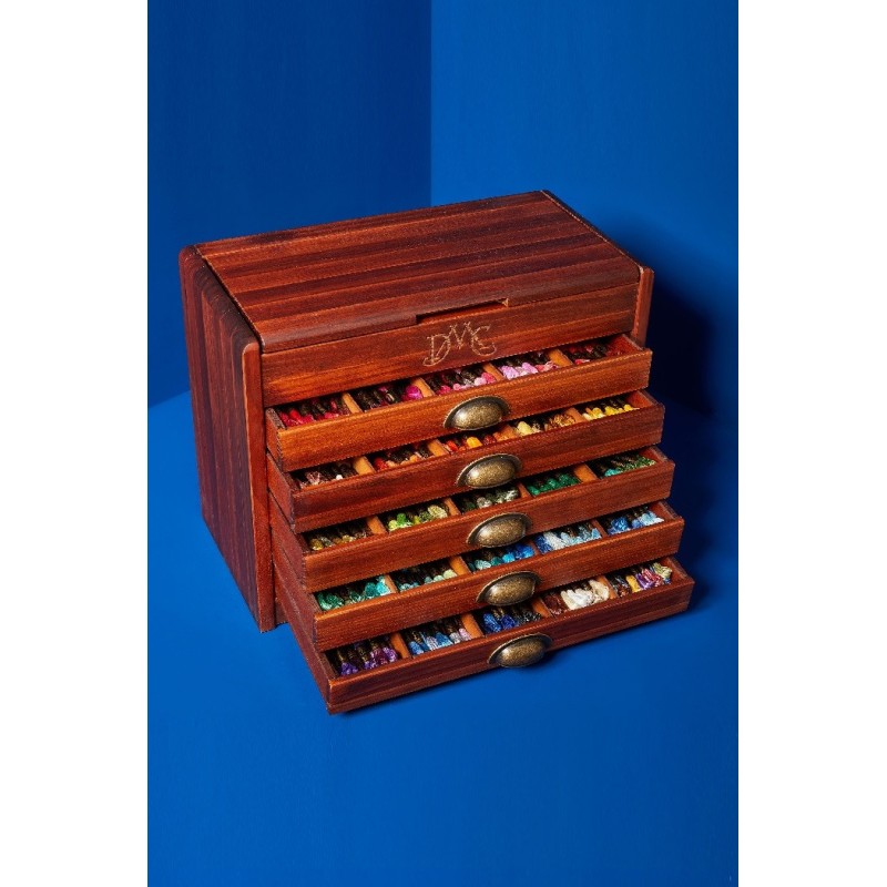 Nádherná Vintage dřevěná skříňka DMC naplněná všemi 500 odstíny bavlnek Mouliné Spécial. Skříňka má vyražené logo DMC, odklápěcí horní víko a 5 zásuvek se stylovými mosaznými úchyty. Vnitřek zásuvek je ještě možné rozčlenit odnímatelnými dělícími přihrádkami.