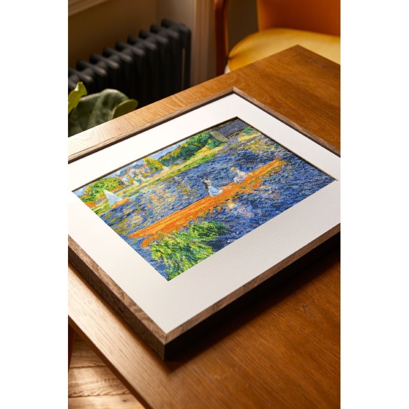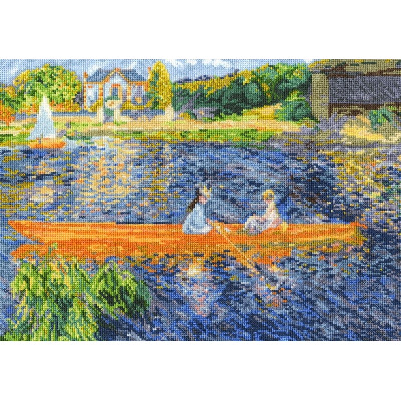 Scéna se odehrává na Seině u Paříže, v popředí je masa rákosí, v pozadí téměř nezřetelná opona stromů, uprostřed plátna mladé dívky v loďce. Renoir evokuje teplo a záři slunce kombinací dvou doplňkových barev, modré a oranžové. Toto skvostné dílo můžete obdivovat v Národní Galerii v Londýně a vyšít si pomocí sady s vyšívacími přízemi DMC Mouliné Spécial.